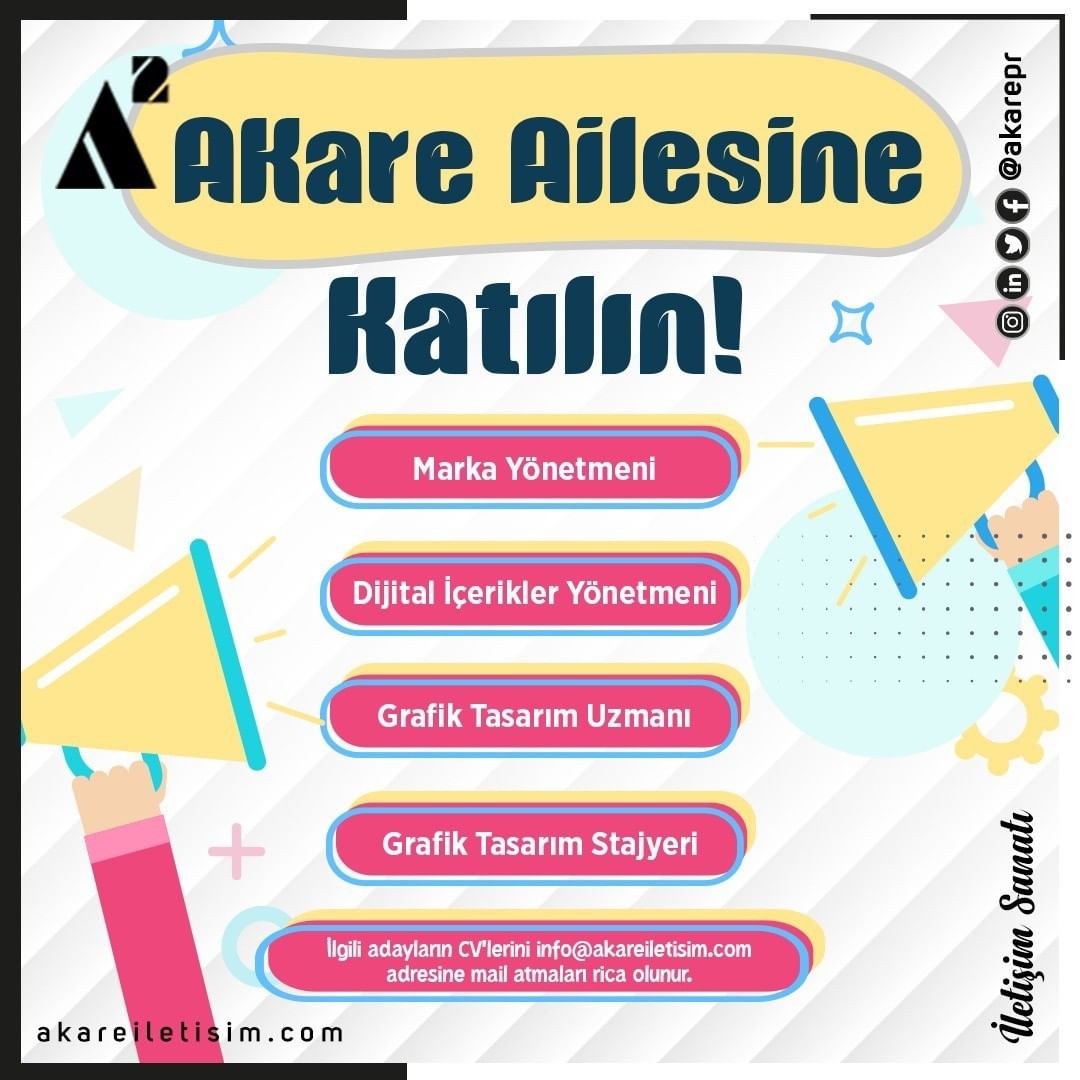 •Tercihen daha önce sağlık, gıda ve endüstriyel markalar ile çalışmış adayların, info@akareiIetisim.com adresine CV iletmelerini rica ederiz.