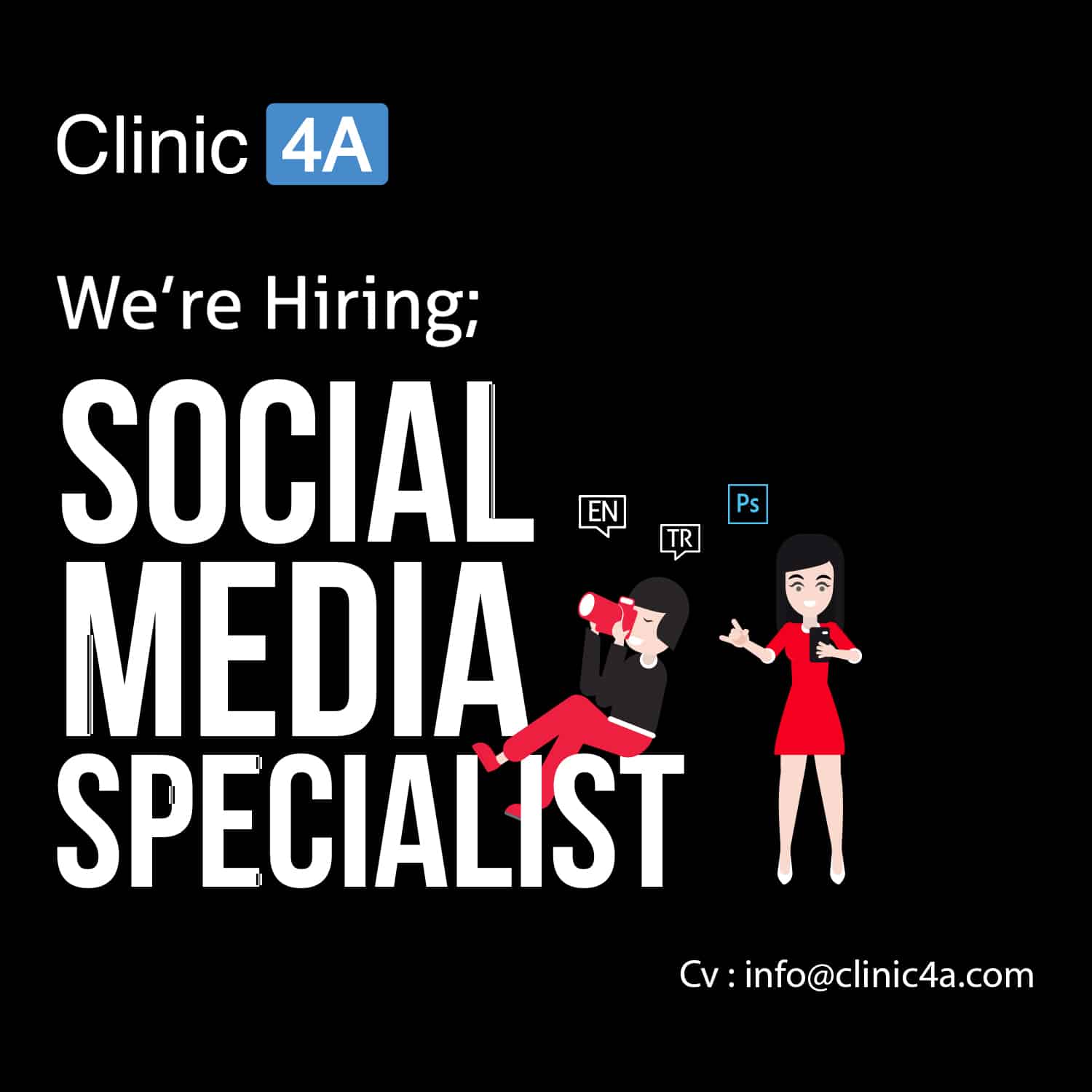 Clinic 4A, Social Media Specialist Arıyor 25 Ocak 2023 0 FacebookTwitterPinterestWhatsApp English (Min B1) Turkish (Advance)? CV : info@clinic4a.com :clinic4a.com/joinus ? Location: Beylikdüzü, İstanbul