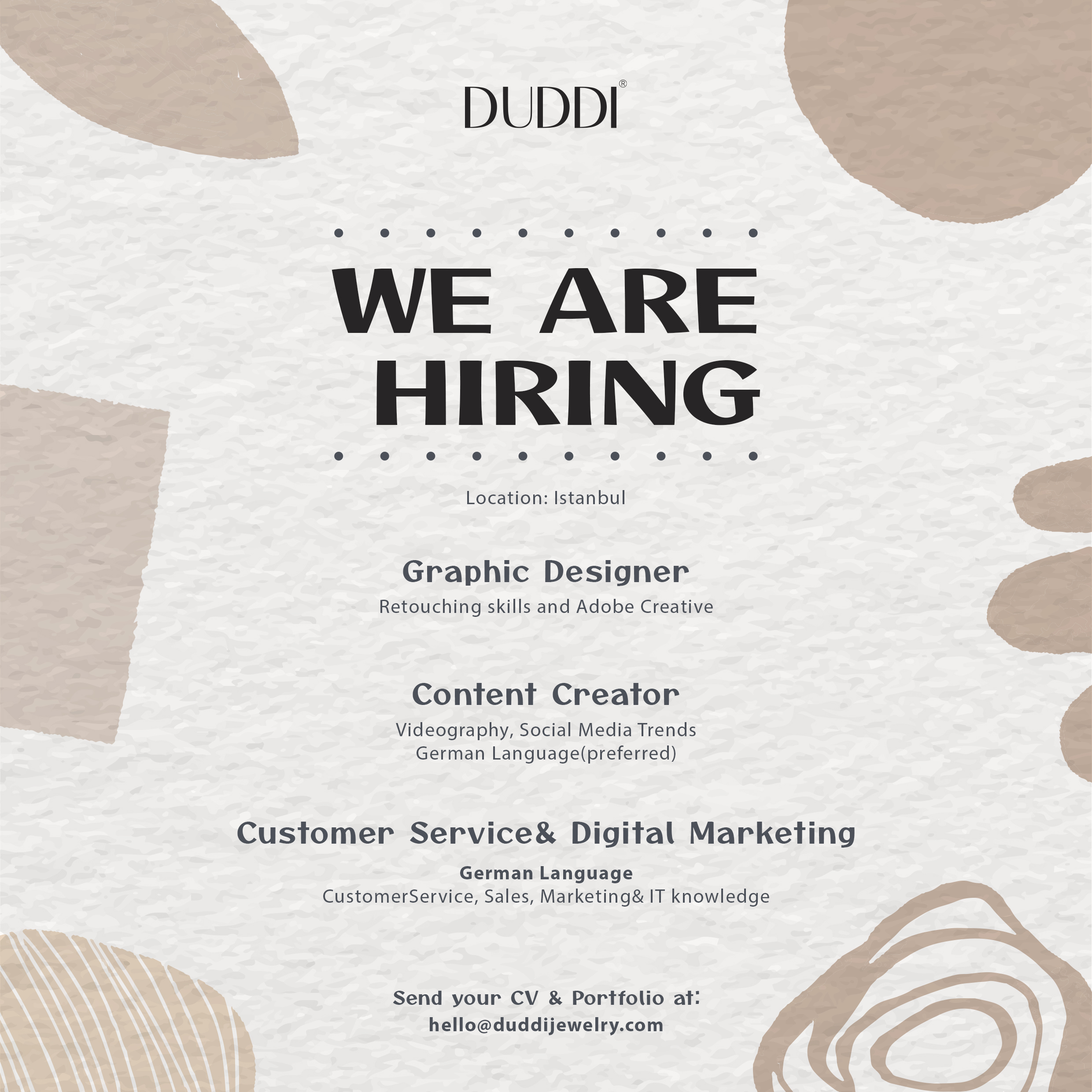 DUDDI, Çalışma Arkadaşları Arıyor 10 Mart 2022 0 FacebookTwitterPinterestWhatsApp CV & Portfolyo: hello@duddijewelry.com