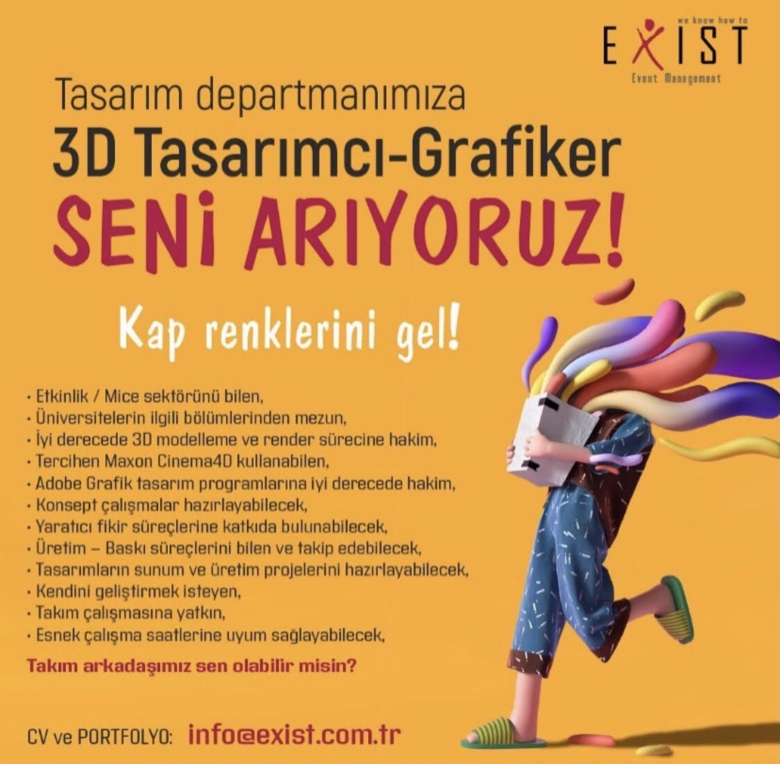 Exist 3D Tasarımcı-Grafiker Arıyor 17 Şubat 2021 0 FacebookTwitterPinterestWhatsApp •••İLAN DETAYLARI••• Tasarım departmanımıza 3D Tasarımcı-Grafiker arıyoruz! Takım arkadaşımız sen olabilir misin? Cv ve Portfolyo: info@exist.com.tr adresinden bize ulaşabilirsin. Lokasyon: Mecidiyeköy, Şişli, İstanbul