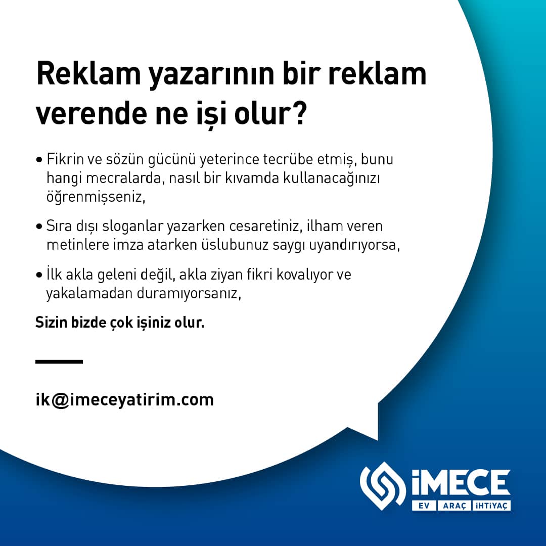 •Tasarrufa Dayalı Faizsiz Finansman Sektöründe zihin kıran çözümleriyle yenilikçi bir dönüşüme hazırlanan; gelecekte Türkiye’nin en ilgi çekici reklam verenlerinden biri olmaya aday İMECE Yatırım Organizasyon A.Ş kendisini yazdıklarıyla konuşturacak Reklam/Metin yazarı arıyor