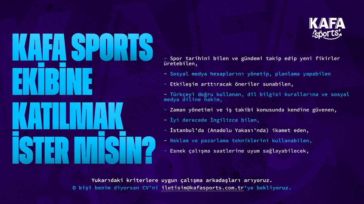 • Yukarıdaki kriterlere uygun çalışma arkadaşları arıyoruz. O kişi benim diyorsan CV’ni iletisim@kafasports.com.tr adresine bekliyoruz.