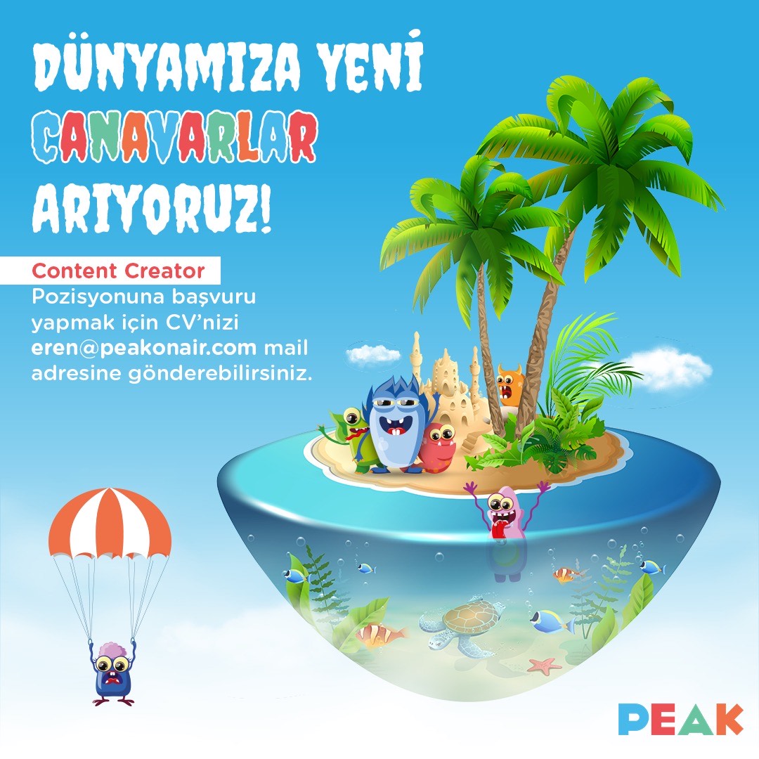 • Ofisimiz gitmek isteyen canavarlara açık fakat zorunlu değil, gönüllülük esasına dayalı. Genellikle uzaktan/evden çalışıyoruz, çeşitli yan hak ve uygulamalarla bu süreci destekliyoruz. Sen de Peak on Air ekibine dahil olmak istiyorsan aşağıdaki mail adresine cv’ni gönderebilirsin.