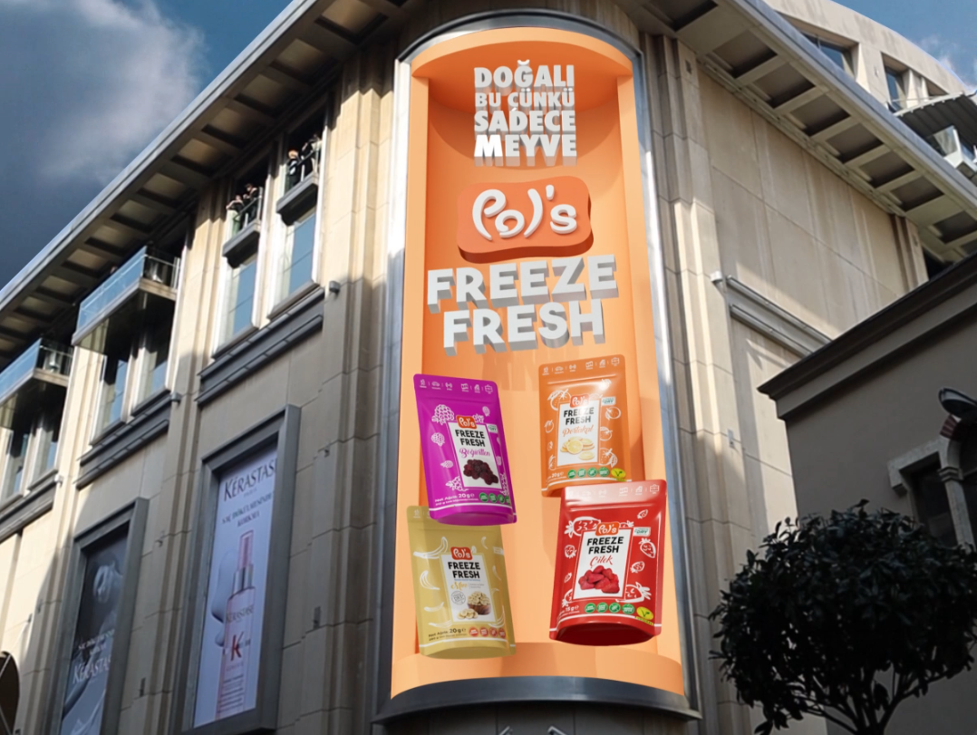 Pol’s Freeze Fresh, Freeze Dry Teknolojisi ile besin değerini koruyan keyifli ve sağlıklı yeni nesil bir atıştırmalık. Dolayısıyla, teknolojisiyle yeni nesil bir mecra olarak niteleyebileceğimiz 3D outdoor uygulamasının Pol’s Freeze Fresh ile eşleştiğini düşündük. Ortaya çıkan bu doğal birlikteliğin, rekabetin yoğun olduğu bir pazarda öne çıkmak ve akılda kalıcı olmak için yaratıcı bir avantaj sağladığına inanıyoruz.