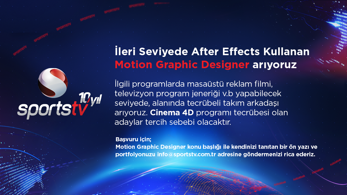 • Başvuru için; Motion Graphic Designer konu başlığı ile kendinizi tanıtan bir ön yazı ve portfolyonuzu info@sportstv.com.tr adresine göndermenizi rica ederiz.