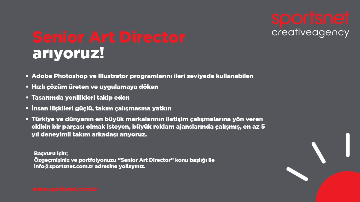 Özgeçmişiniz ve portfolyonuzu “Senior Art Director” konu başlığı ile info@sportsnet.com.tr adresine yollayınız.