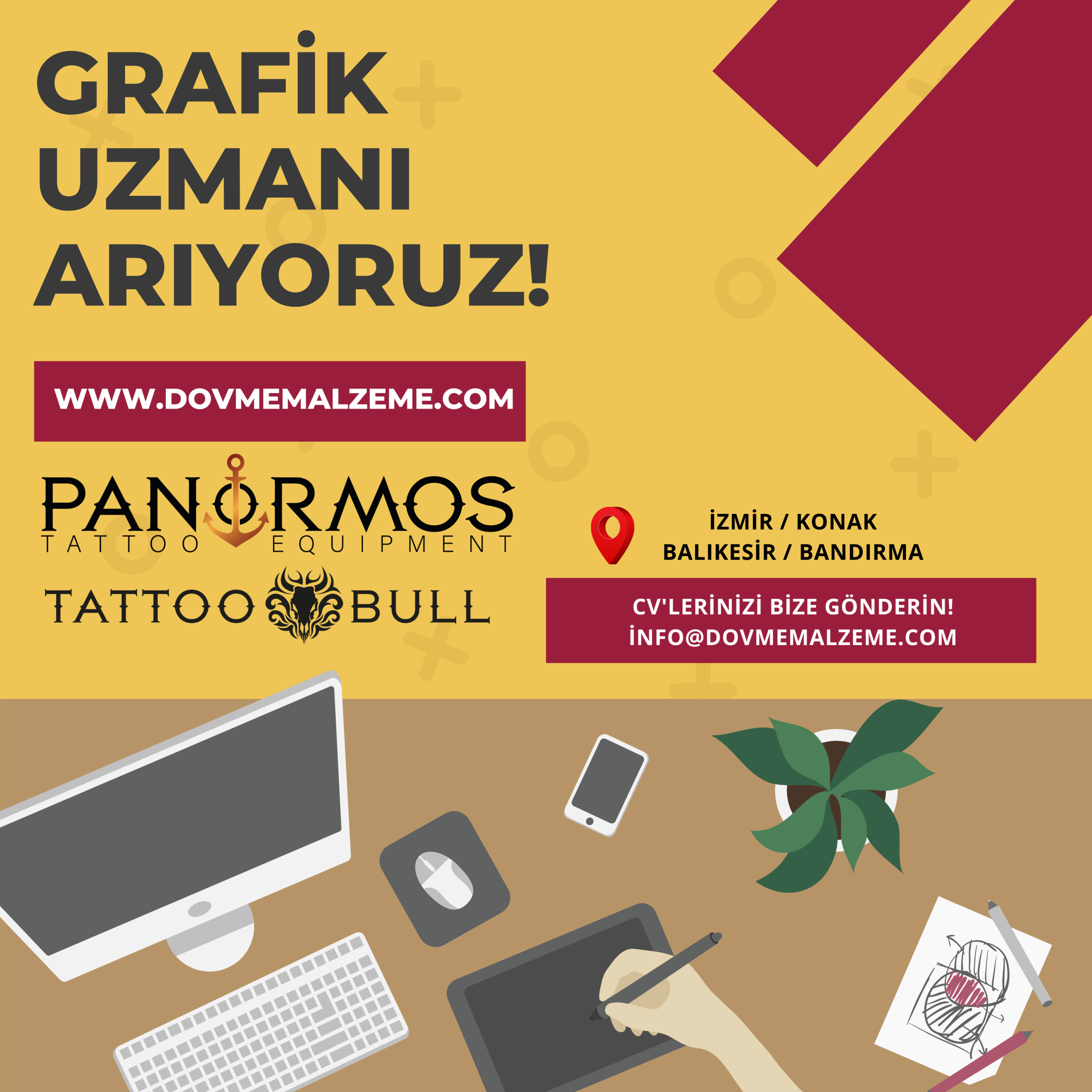 Sektöründe öncü olan ve dövme malzemeleri ithalatı ve ihracatı yapan firmamız Panormos Tattoo Equipment / www.dovmemalzeme.com ve firmamızın dövme stüdyosu olan Tattoobull Tattoo Studio bünyesinde çalışacak Grafik Tasarım uzmanları arıyoruz.