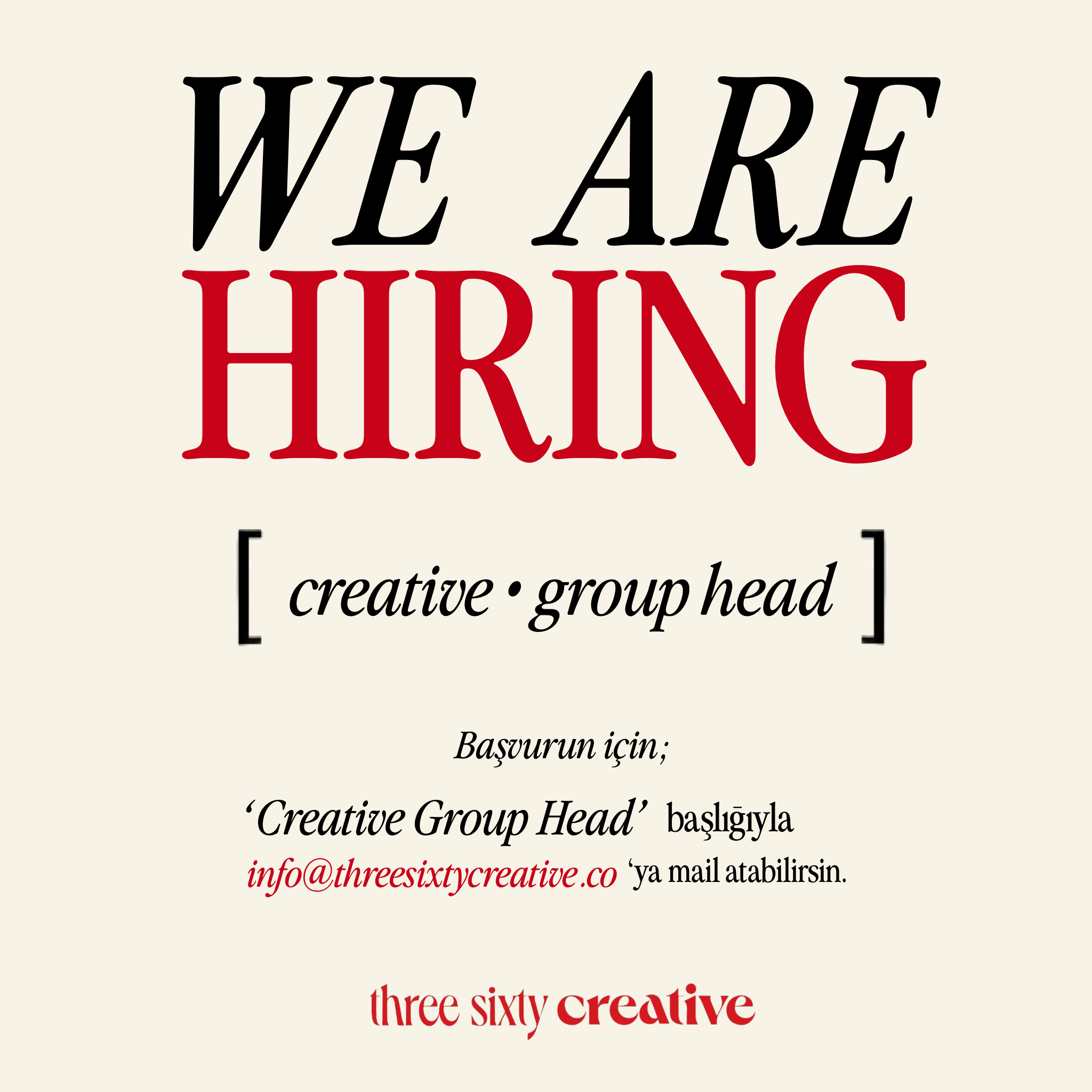 📩 ‘İŞTE BU BENİM’ DİYORSAN ‘Creative Group Head’ başlığıyla info@threesixtycreative.co‘ya mail atabilirsin.