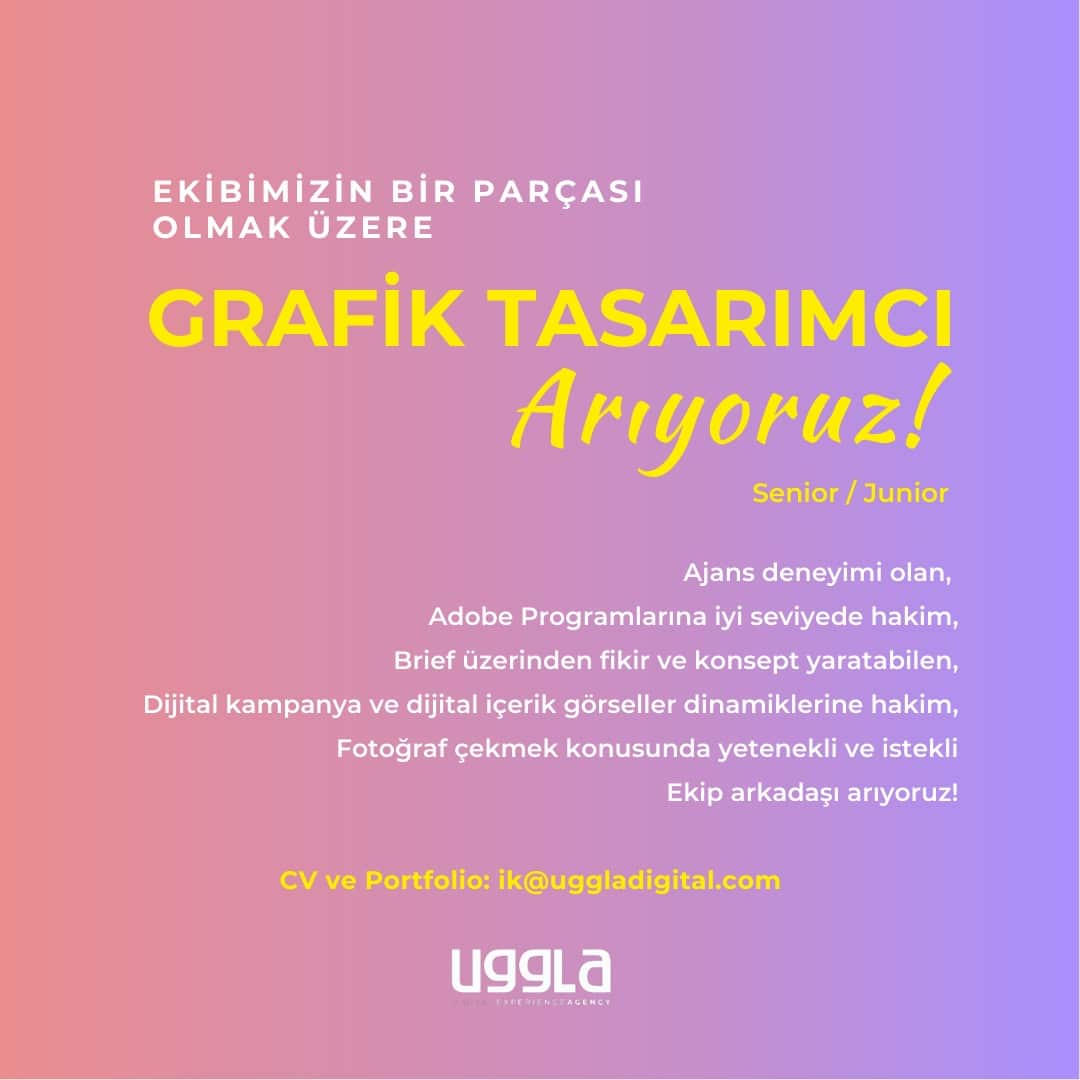 • Portfolio ve CV’lerinizi ik@uggladigital.com adresine mail olarak iletebilirsiniz.
