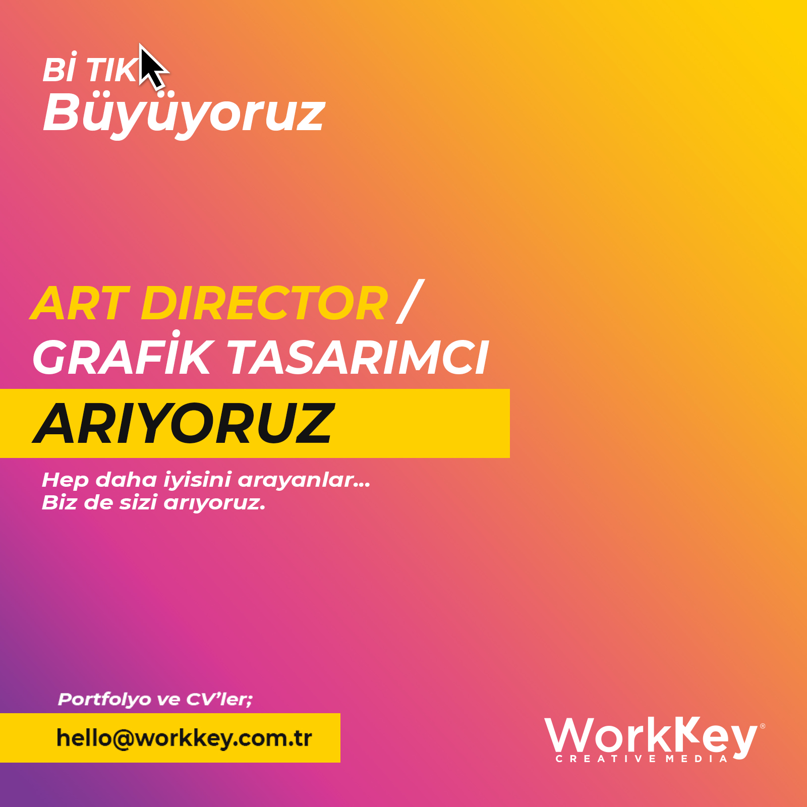 •Yenilikçi ve kreatif takım arkadaşlarının cv ve portfolyalarını hello@workkey.com.tr adresine bekliyoruz.
