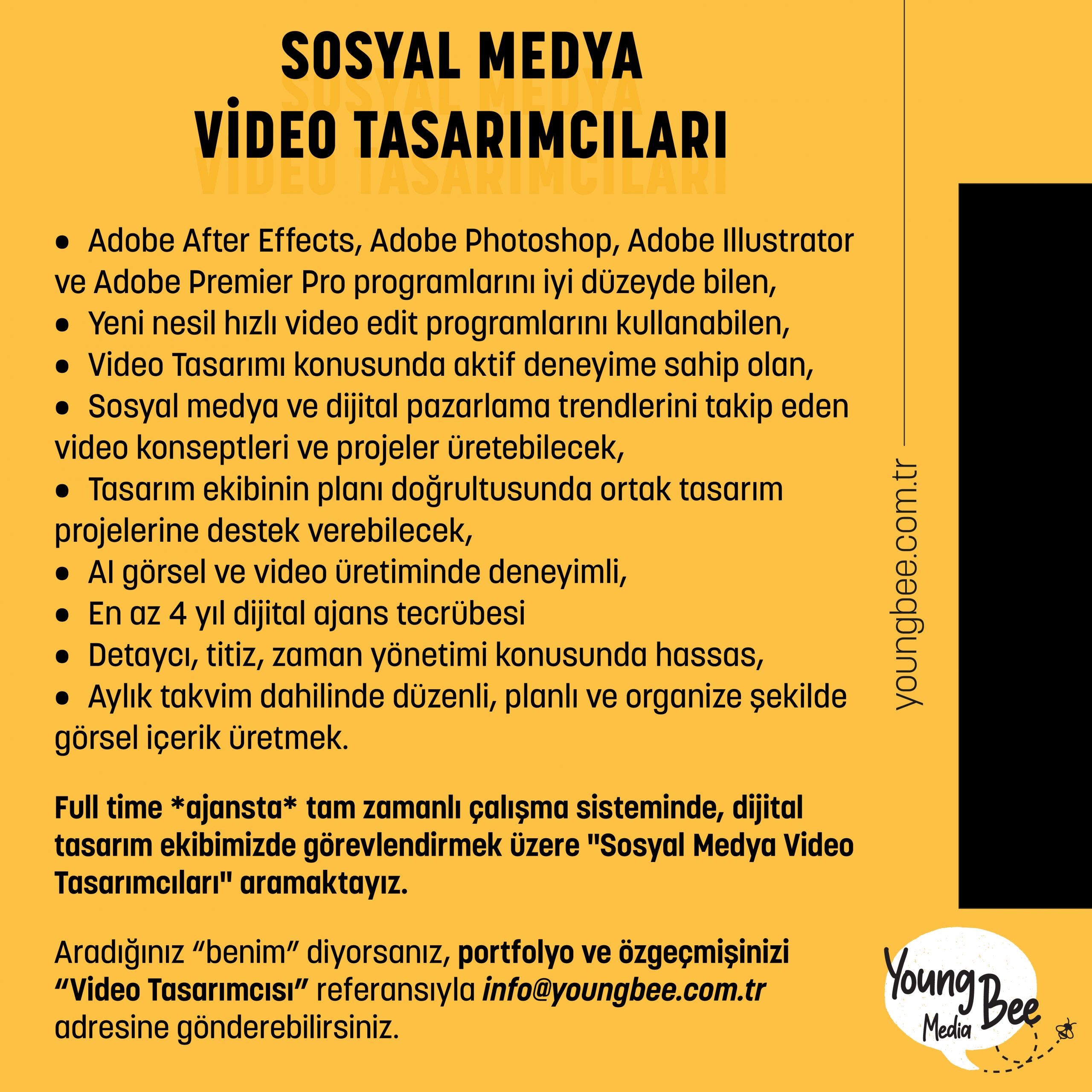 • Aradığınız “benim” diyorsanız, portfolyo ve özgeçmişinizi “Dijital Video Tasarımcısı” referansıyla info@youngbee.com.tr adresine gönderebilirsiniz.